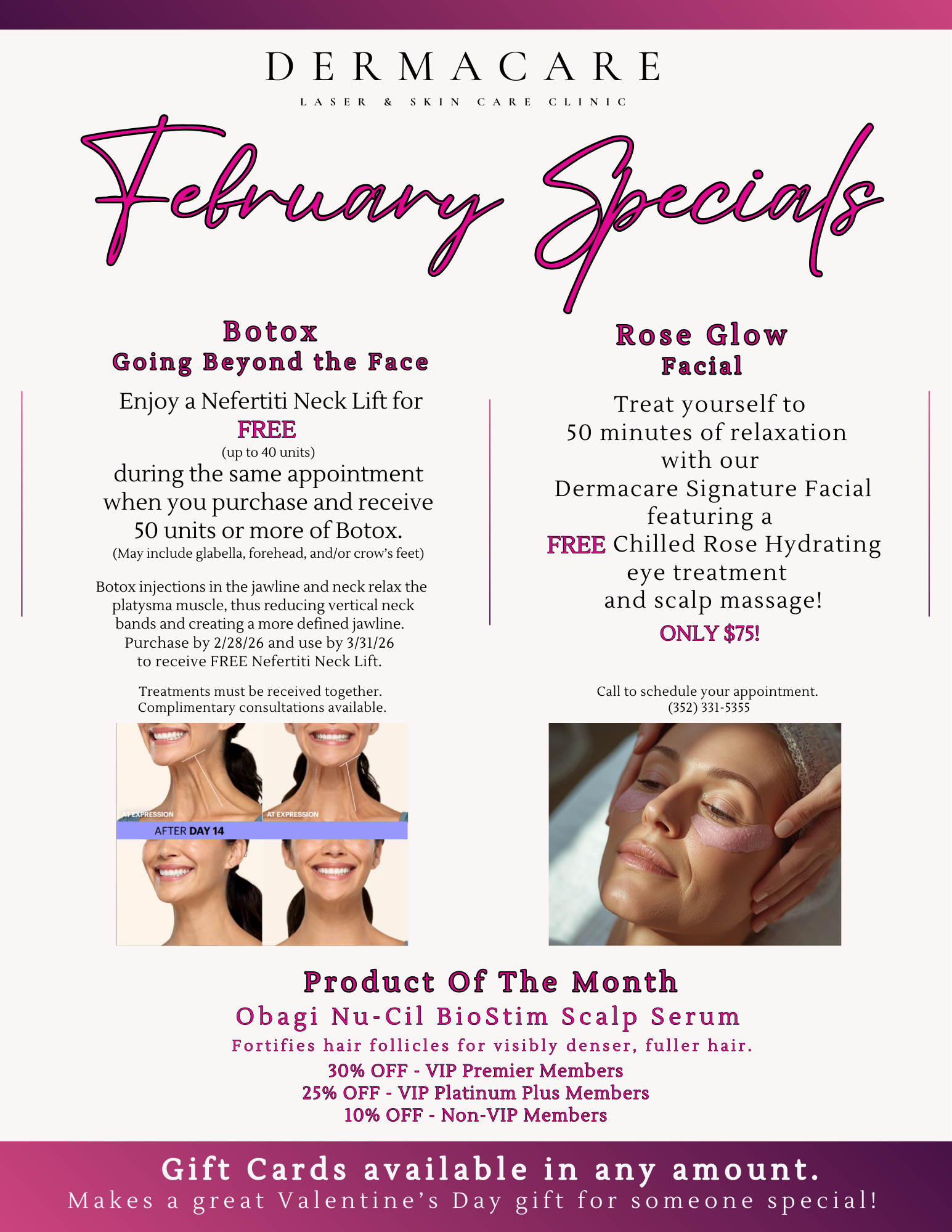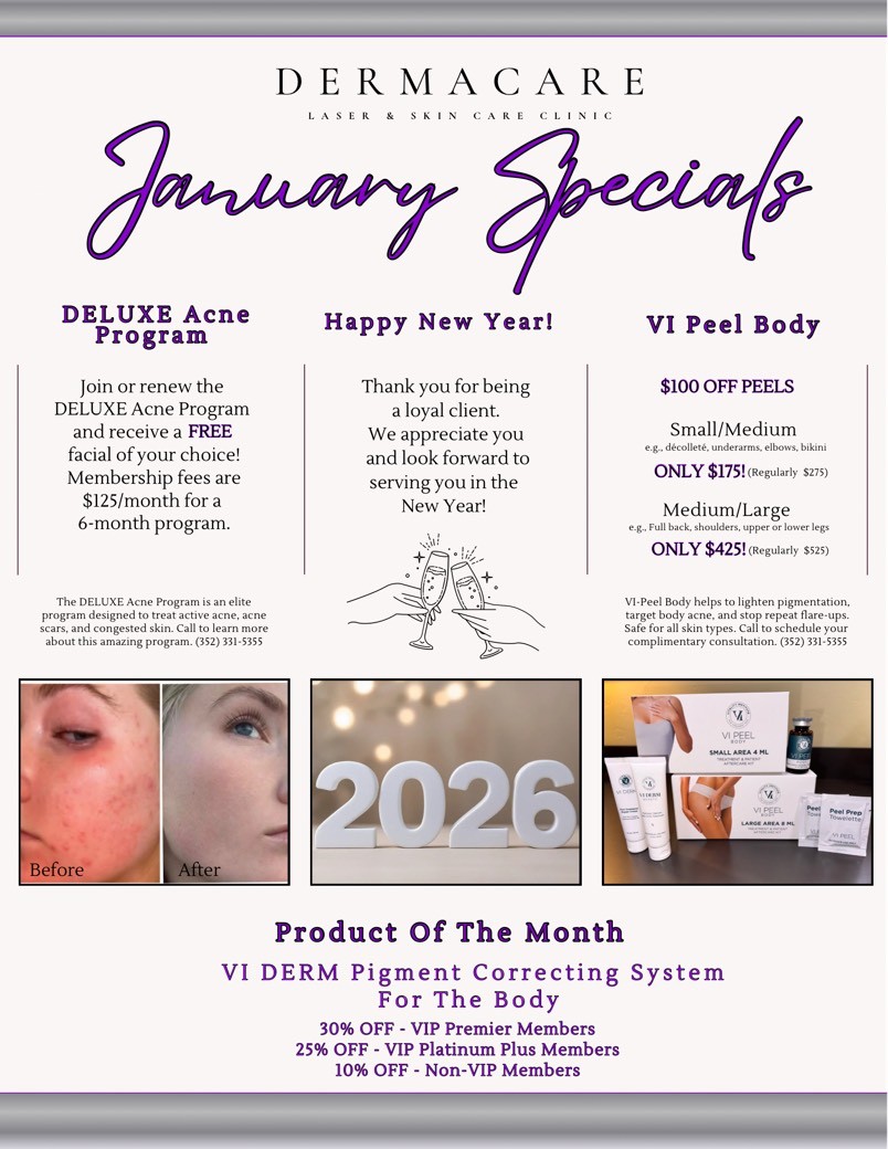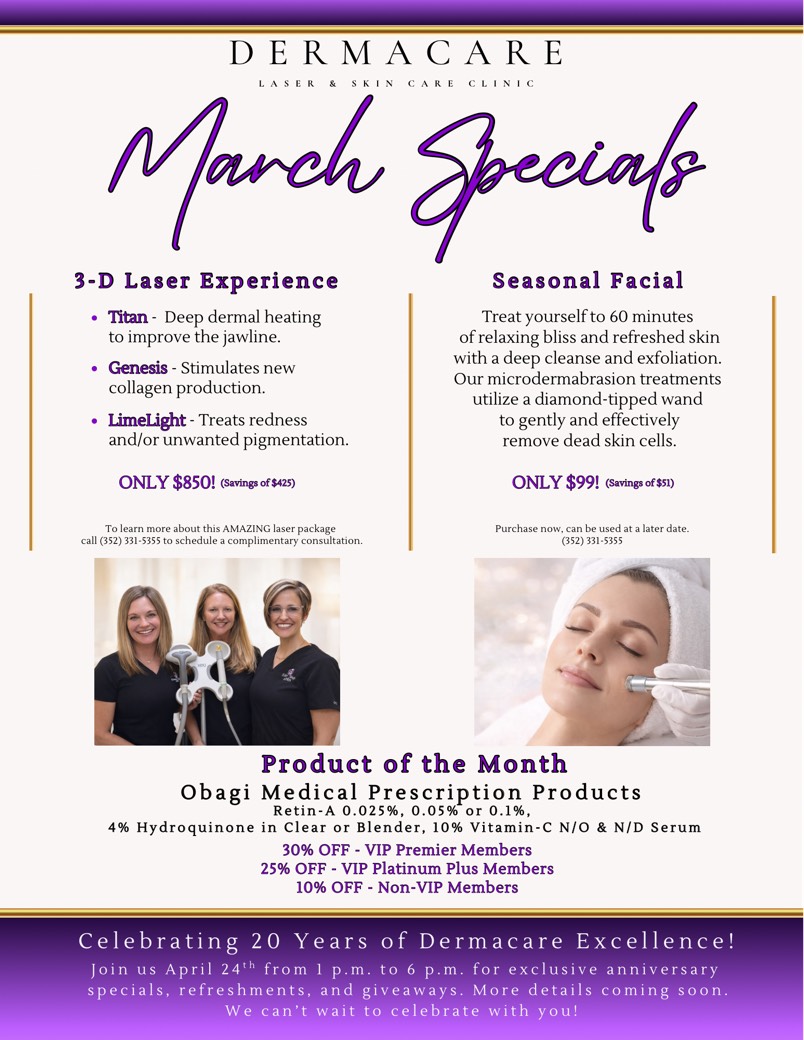 Want to learn more about our Specials? Schedule a FREE consultation with Kiahla, Dermacare’s Consultant of 19 years. Our friendly Front Office staff will be happy to schedule the appointment for you. Call 352-331-5355.
